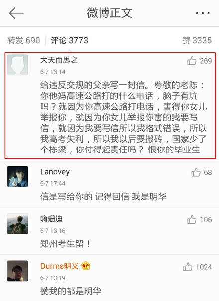 “导火索”是高考全国语文卷卷一,适用于河南、河北、山西、江西、陕西等省份。该题目引用了5月9日的一则新闻报道:一位父亲在高速公路上开车打电话,旁边的孩子“小陈”一再提醒后仍不听劝,最后孩子向交警举报父亲,由警方对父亲进行了批评教育。要求考生以此材料,以“明华”的名义给父亲、女儿或警方写一封信。