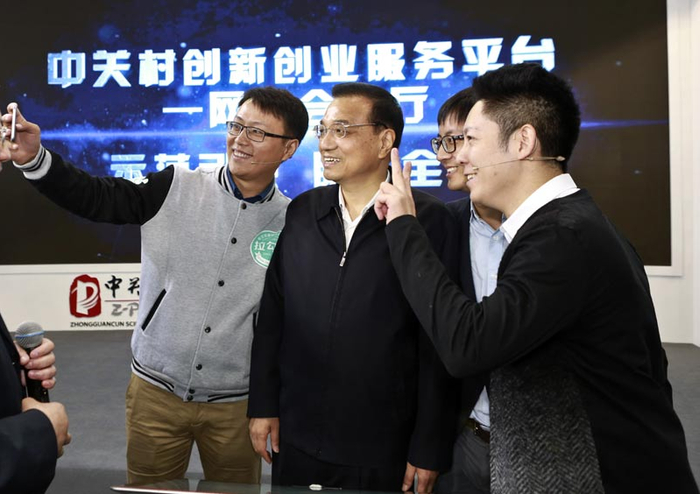 图为国务院总理李克强在北京出席首届“全国大众创业万众创新活动周”,并考察主题展区与创业者合影。
