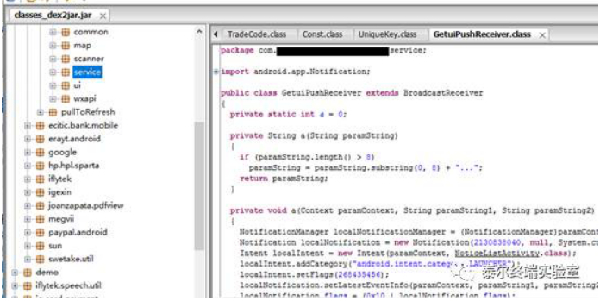 实验室的工程师使用反编译工具、反汇编软件对手机银行APP进行反编译,发现手机银行APP可被反编译并且泄露出大量有效代码。黑客能够通过反编译,在客户端程序中植入木马、恶意代码以及广告等,客户端程序如果没有自校验机制的话,黑客可以通过篡改客户端程序窃取手机用户的隐私信息。