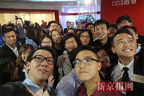 记者会后,林郑月娥与在京港籍学生代表和商界代表合影。新京报记者 侯少卿 摄