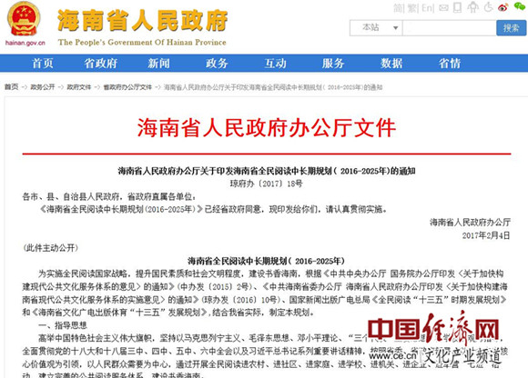 海南省全民阅读中长期规划(2016-2025年)