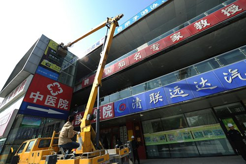 又讯,今天上午,海淀区城管执法监察局清河执法队联合清河街道,出动150人,对京藏高速路周边建筑物上的违规牌匾进行查处,拆除上清桥西北侧强佑新城写字楼55块违规楼体广告。
