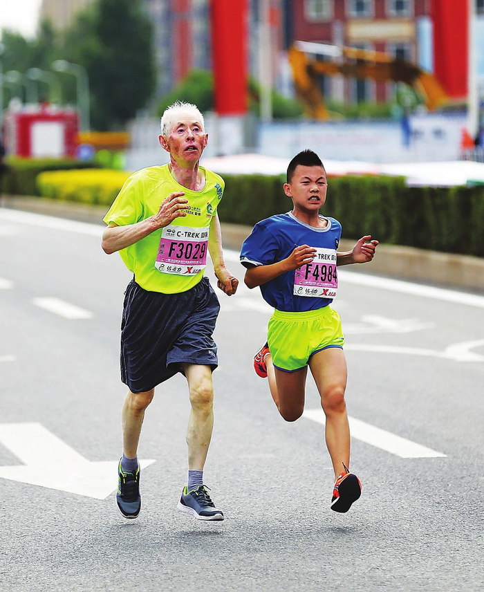 ②祖孙二人一同冲刺。