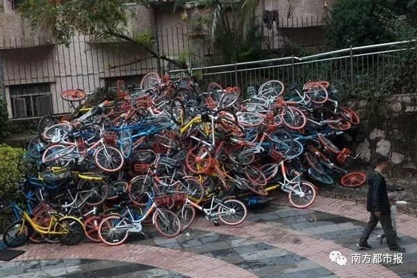 自共享单车面世以来,随处乱停、恶意破坏等现象层出不穷。在今年4月,北京一ofo共享单车维修点,近万辆损坏的小黄车被堆放在马路边,覆盖长度约300米,远远看去宛若一座尸山……
