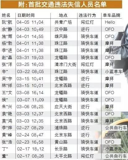 从5月15日起,南京交警与摩拜、小蓝、OFO等8家共享单车企业建立信息共享“黑名单”机制,并公布了首批20名交通违法失信人员名单。