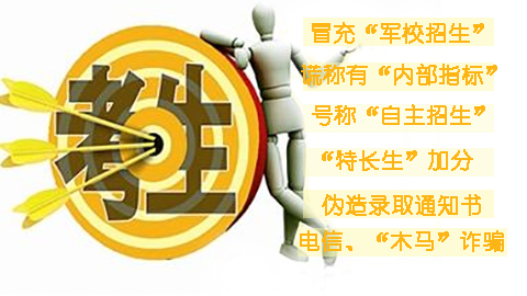 据介绍,近年录取中,不法分子惯用的诈骗伎俩主要有以下六种:自称军校机关或招生部门人员,谎称有“内部招生指标”“计划外招生指标”;谎称能办理艺术、体育、小语种等各类“特长生”加分;伪造录取通知书;发送虚假查分网址,根据家长填写的个人信息进行精准电信诈骗;以高考为由头的“木马”诈骗;以“自主招生”名义行骗,把“自主招生”渲染成“自由招生”。