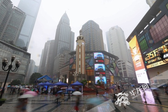 大雨中的解放碑步行街,各色雨伞穿行而过。记者 李裕锟 摄