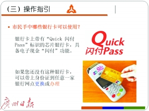 此次新推的支付方式中,金融IC卡电子现金支付,首先要求用户的银行卡上须带有“Quick 闪付Pass”标识的芯片银行卡,具备电子现金“闪付”功能。持卡人在使用“闪付”功能之前,要确保金融IC卡电子现金有足够的余额。目前,支持电子现金圈存的设备包括:ATM机、POS机、银联网络推出的可随身携带的“易POS”等。
