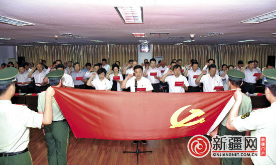 6月16日,米东区委中心组召开集体发声亮剑宣誓大会,市人大常委会副主任、米东区委书记乔泉及区人大、区政府、区政协四套班子领导在党旗下宣誓。(通讯员席辉摄)