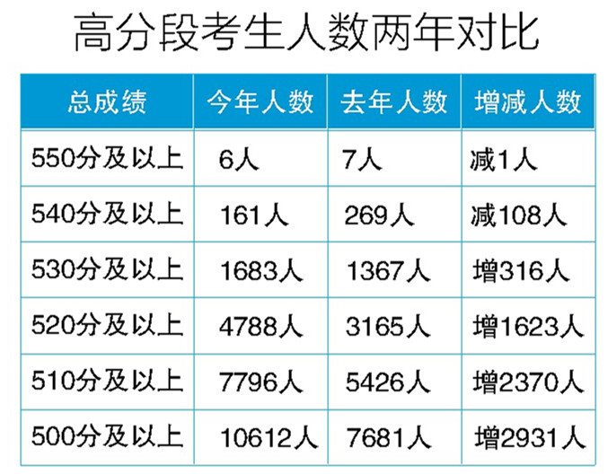 位次表内容显示,540分以上考生161人,比去年减少约100人;530分以上考生1683人,比去年增加约300人;500分以上考生10612人,比去年增加约3000人,高分考生人数较去年显著增加。专家预测,今年省重点高中第一批次统招录取分数线或将高于去年,文化课裸分420分至450分段内分数密集,0.5分并列上百人,竞争将更加激烈。