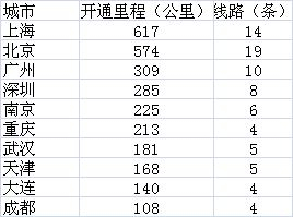 地铁通车里程前十名城市