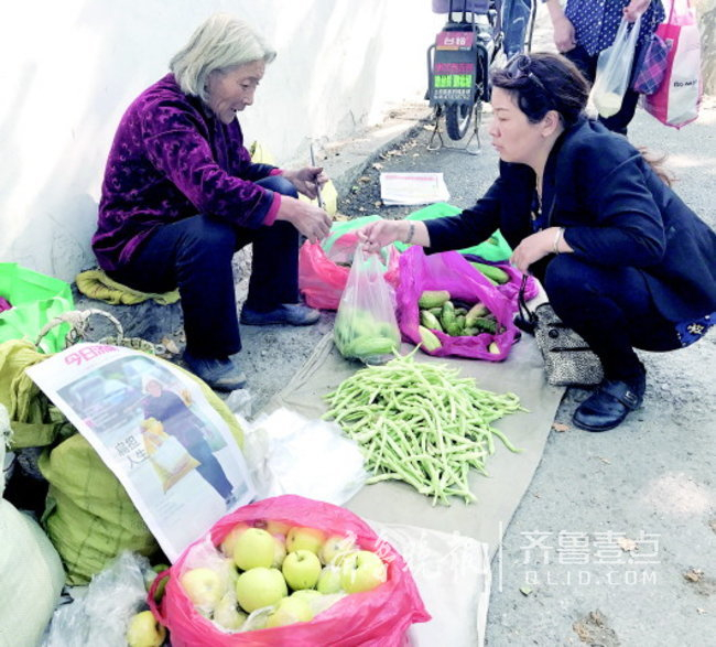 “原来是在这里啊,我今天在齐鲁晚报上看到报道了,特地过来的。”说话间,一名身穿浅绿色上衣的年轻女子停在了摊位前,“芸豆来一点,丝瓜就剩这些了啊,我都要了吧,还有黄瓜也要点。”年轻女子说,她经常经过这里,这是第一次注意到“扁担奶奶”。