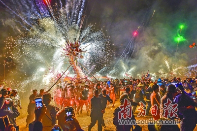 截至2016年底,梅州市列入国家、省、市、县四级非物质文化遗产名录项目共计299项项。图为国家级非物质文化遗产丰顺埔寨烧火龙。
