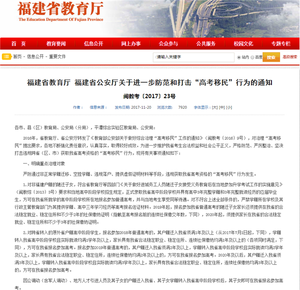 这份题为《福建省教育厅、福建省公安厅关于进一步防范和打击“高考移民”行为的通知》(闽教考〔2017〕23号)的文件,明确重点治理的对象是“通过非正常学籍迁移、空挂学籍、违规落户、提供虚假证明材料等手段”违规获取福建省高考资格的“高考移民”。