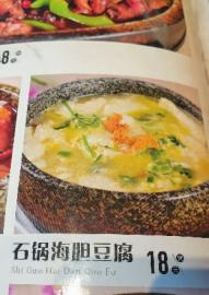 同时,刘老板还出示了该店的菜牌,并称每道菜都是实拍图,“石锅海胆豆腐”这道菜的配图上,表面黄色像蛋黄的几块东西,就是这种“原汁海胆”,因此并不存在欺骗消费者的问题。
