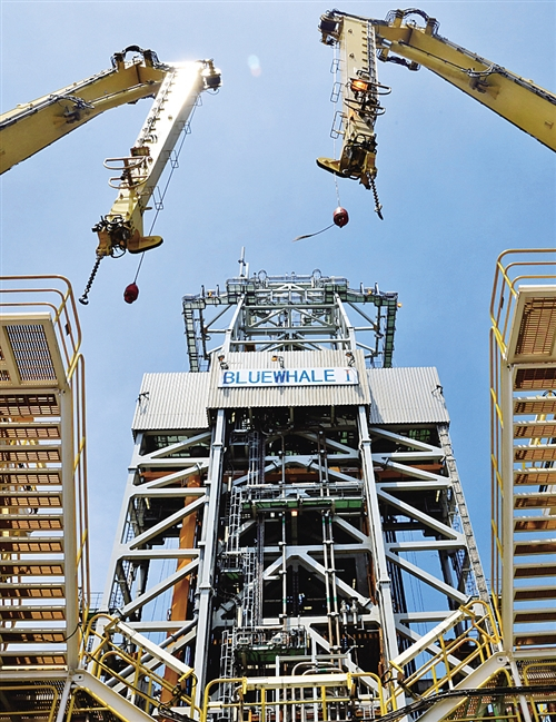 我国在南海神狐海域试采可燃冰的钻井塔。(新华社发)