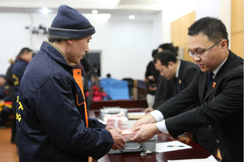 “昌平法院‘春节暖心行动——把薪带回家’案款发还活动正式开始。”在昌平法院执行局干警的引导下,农民工们排成队,逐一上前领取劳务费。
