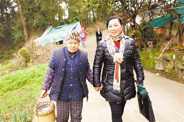 黄明琼(右)拉着八十三岁高龄的老党员兰定珍的手边走边聊,了解乡风文明建设情况。特约摄影 刘辉