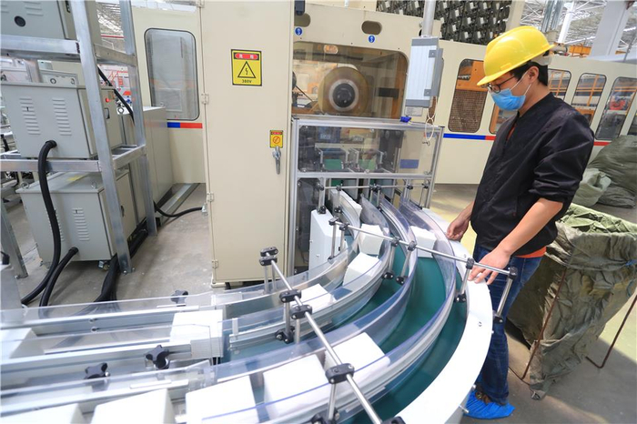 ↑3月30日,九江瑞昌,植护纸巾工厂,一名工人在流水线前检查纸巾。植护纸巾依托拼多多平台,一款抽纸单品连续五天销售额达百万。