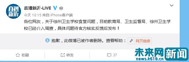 记者找到爆料徐州卫生学校食堂卫生存在问题的微博,发现该微博已被作者删除,取而代之的是,一篇新的微博,该微博表示,“关于徐州卫生学校食堂问题,目前教育局、卫生监督局、徐州卫生学校已经介入调查。”