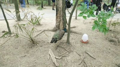 动物园的孔雀为蓝孔雀,有雌雄之别,雄孔雀有羽冠和长长的尾羽,这两个部位的羽毛非常好看。就在不久前,4只雄孔雀遭遇“拔毛”之痛——长长的尾羽被游客拔掉,其中两只尾羽基本被扒光,成了“秃尾”,受损严重。