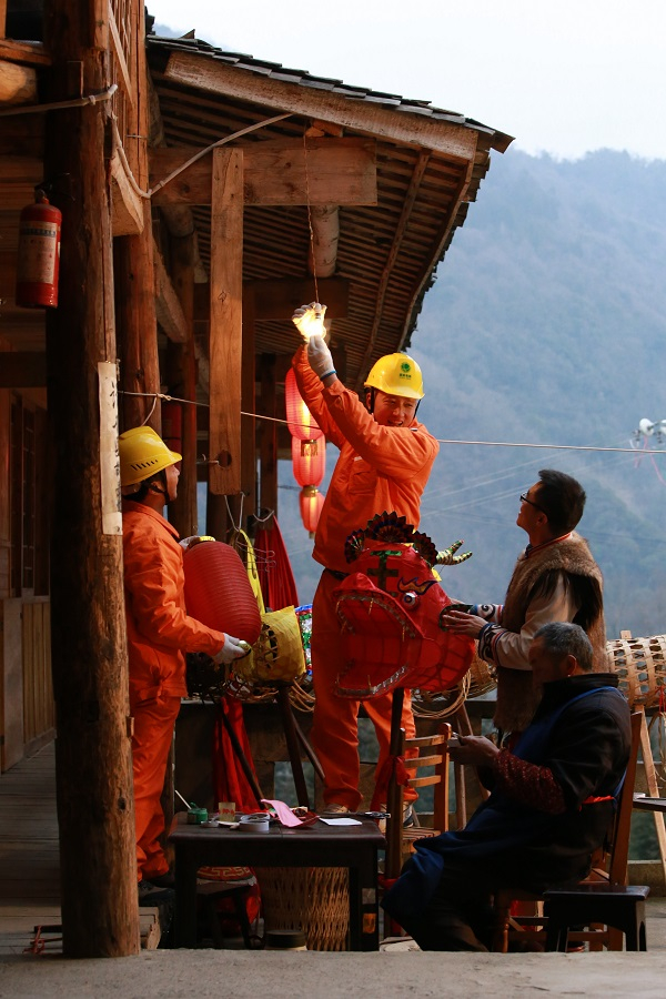 2017年羌历新年,北川供电公司接到报修电话,党员服务队紧急出动抢修,灯亮了,羌寨一派喜气洋洋的新年氛围。田海 摄