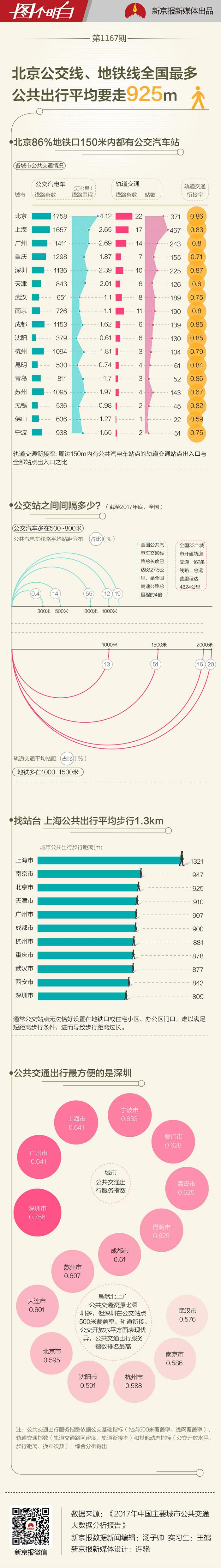 对于普通人而言,关心更多的是公共出行方不方便?站台好不好找?从全国看,公共汽电车网络500~800m平均站距的线路占55%,轨道交通平均站距近半集中在1000m-1500m这一区间。因为站点密度,以及站点与住宅小区、办公区门口等间距不同,城市公共出行步行距离也有差异,其中上海达1.3千米,深圳为809米。(更多新闻,请关注新京报微信公号:bjnews_xjb)