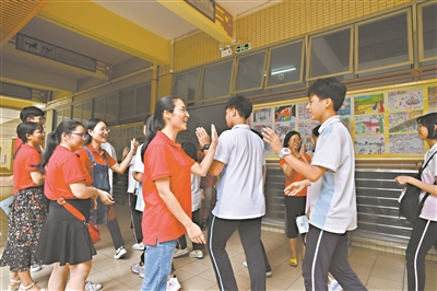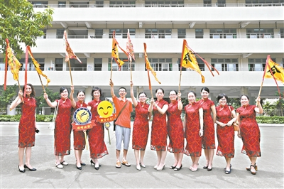 旗开得胜:顺峰中学语文组老师们穿上酒红色旗袍给考生送考。