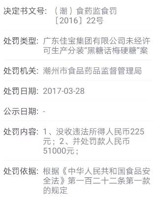 但据工商信息显示,早在2017年3月,佳宝集团因未经许可生产分装“黑糖话梅硬糖”案,被潮州市食药监局没收违法所得人民币225元,并处罚款51000元。