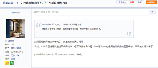 此前在冠道的召回信息发布之时,便有舆论表示UR-V召回在所难免,而UR-V也确实“不负众望”,于3天后宣布召回,并再次引起了消费者们对于本田1.5T发动机的担忧。