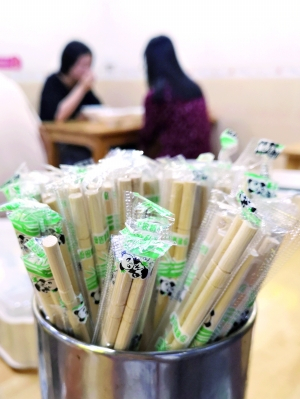 金菊路附近的沙县小吃店提供的套装消毒筷子。