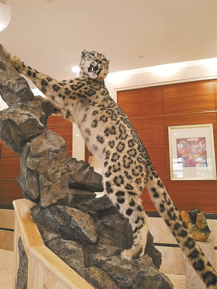 雪豹大会会场外展示的雪豹标本栩栩如生。