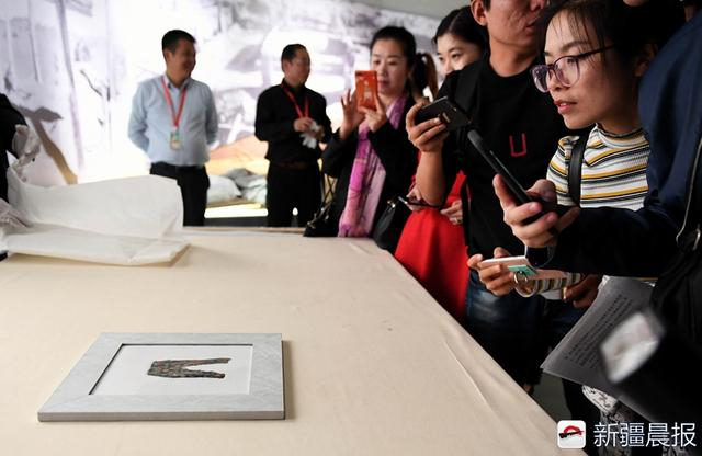 19日下午,在新疆博物馆举行的“五星出东方利中国”锦等文物的开箱仪式上,记者有幸见到了这件国宝级文物的真迹,这件色彩醒目的织锦仅有巴掌大小,当它被小心翼翼地摆放在桌上时,记者们纷纷拥向前观看拍照。
