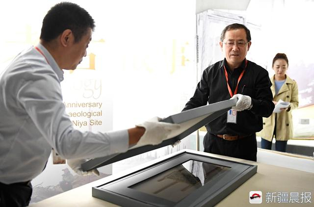 9月19日下午,新疆维吾尔自治区博物馆党委书记、副馆长石俊(左),该馆馆长、研究馆员于志勇(右)开箱