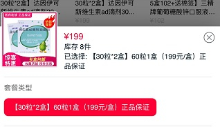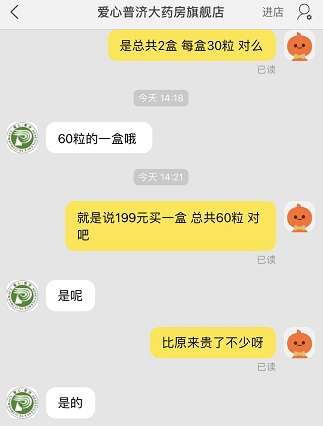 伊可新这种缺货状态,也体现在多个电商平台。1月6日,新京报记者在叮当快药、京东大药房、阿里健康大药房等平台查询发现伊可新均处于缺货状态。值得注意的是,1月10日,记者再次登录上述平台,部分仅有少量库存的药店已经开始抬高价格出售。以0-1岁儿童适用的绿色伊可新为例,售价为39.8元/盒(30粒装)左右,但在阿里健康大药房平台爱心普济大药房旗舰店,一盒60粒装的绿色伊可新已经卖到每盒199元。在与记者的交流中,店家也承认确实比之前提价不少。另外,多家药店均提示“预计1月底到货”。