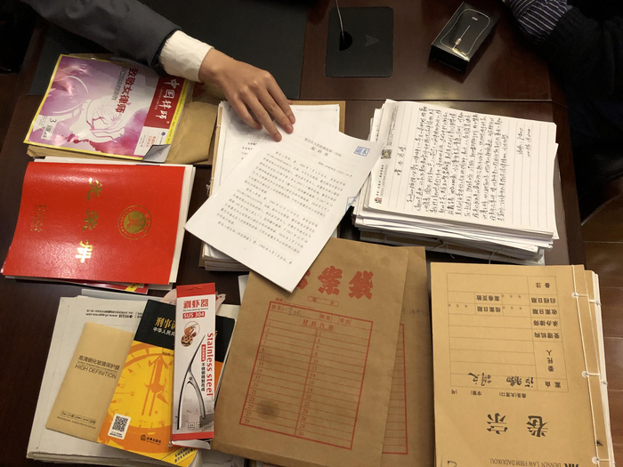 唐帅的办公桌上堆满了卷宗和案件资料。新京报记者 李一凡 摄