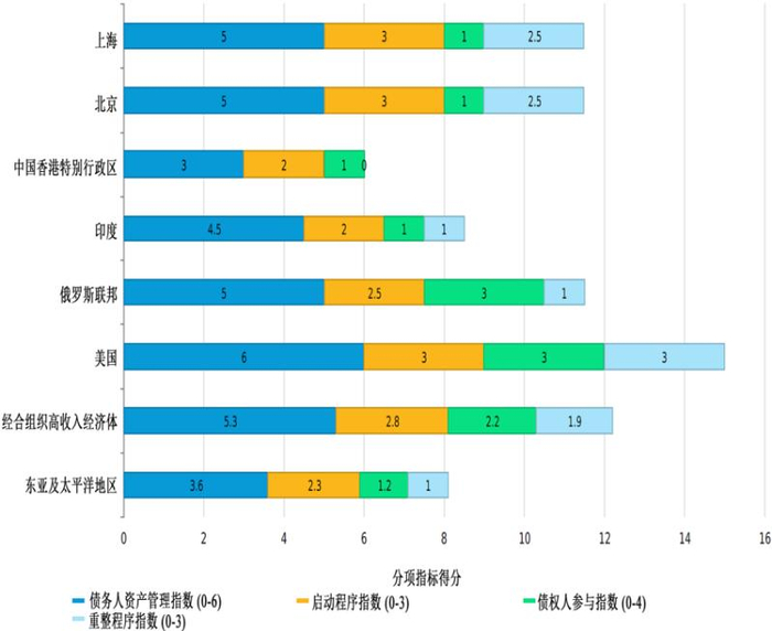 以上指标中,较难理解的是二级指标“破产框架力度”,它由4个三级指标构成:启动程序指数、债务人资产管理指数,重整程序指数和债权人参与指数。该指数取值范围为0-16,数值越高,表示破产法律制度越利于恢复可存活的企业和清算不可存活的企业。