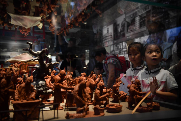 小朋友们观看反映老北京生活的泥塑。摄影/新京报记者 李木易