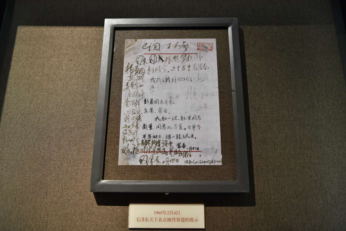 “档案见证北京”展览展出的毛泽东关于北京地铁筹建的批示。摄影/新京报记者 李木易