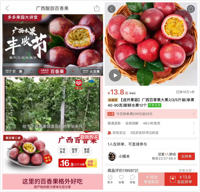 作为近两年的网红水果,百香果备受一、二线城市消费者喜爱。基于拼多多消费端稳定的需求,广西百香果产区已实践大规模“计划性生产”。“我们很早就去果园看过水果,刚开花时就已给果农下了定金”,参与百香果活动的商家表示,百香果是当地主要水果作物,为保证品控,从地里采摘时就需要挑选,以给消费者更好的体验。另一位活动商家则对销售火爆情况大感惊讶,本以为活动正值端午假期,销售不一定那么火,未承想借“618”大促,水果过了个大节,“我们必须连夜发货,以保证消费者能及时收到水果。”