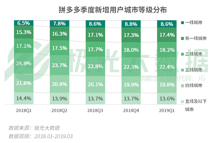 数据显示,2019年第一季度,拼多多有44.2%的新增用户来自二线及以上城市。