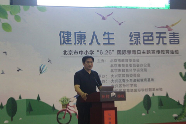 6月18日,北京市中小学“6·26”国际禁毒日主题宣传教育活动在大兴区孙村学校召开,本次活动由北京市教育委员会、北京市禁毒委员会办公室、北京市教育科学研究院主办,大兴区教育委员会承办,大兴区法制教育基地、大兴区孙村学校和朝阳区芳草地国际学校朝丰分校协办。全市各区教委毒品预防教育工作负责人、中小学德育干部等共200余人参加本次活动。