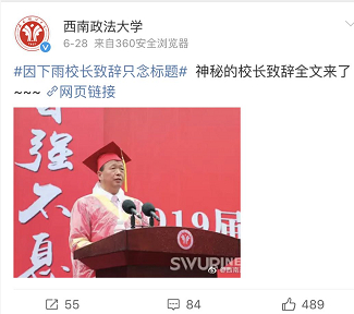 据媒体报道,近日,西南政法大学的毕业典礼遭遇大雨,校长付子堂来做毕业致辞时,他只挑选了重要的内容进行了简短演讲,并表示,“因为下大雨,所以毕业演讲我就只念标题了,全文我会发布到网上,劳烦各位自行上网查看。”