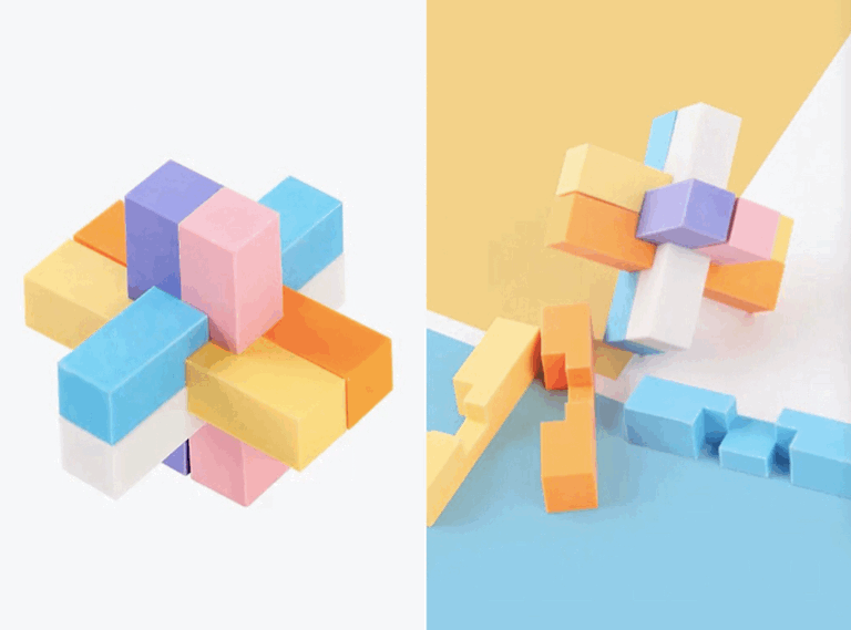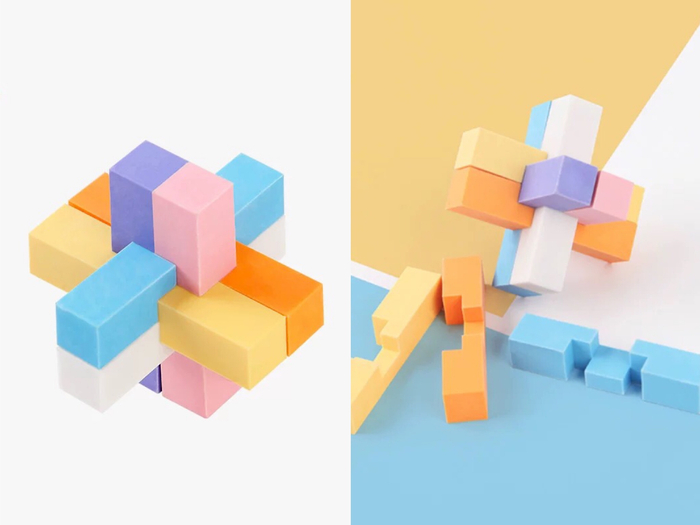 除了将故宫内的皇家图腾、文物上的图案运用到文具上,一款榫卯橡皮也让网友直呼“脑洞大开”。这款榫卯橡皮设计灵感来源于故宫建筑的大殿、藻井、歇山顶等,是榫卯鲁班锁结构中入门级的一款。橡皮可以分拆成六个部分,每部分颜色不同,要按照先后顺序才能最后拼装完成。