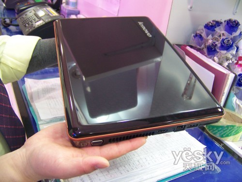 外观上,联想Y550A-PSE(F)采用15.6英寸LED背光宽屏,拥有1366X768的分辨率以及16:9的黄金比例,屏幕上方有一枚带人脸识别、130万像素的摄像头,外壳采用棕黑色的顶盖,看着时尚华丽的同时并且不容易留下指纹,在灯光的照耀下,能看到顶盖中隐藏着六边形图案组合,橙色镶边,“ideapad”LOGO颇具时尚风格,采用了“白色钢琴烤漆”。