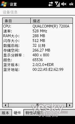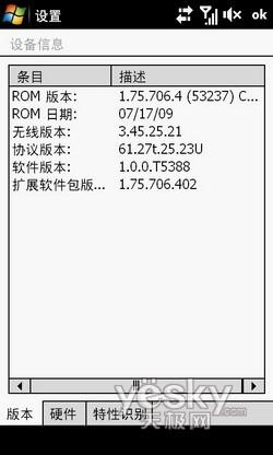 T5388使用的是Qualcomm MSM7200A的CPU,其频率仍为528MHz。内存配置方面则由原来256M的ROM和196M的RAM升级到512M和288M,在运行软件时速度的提升尤为明显。T5388提供对SDHC存储卡的支持,最高可以达到8GB。在数据传输方面T5388支持GSM/GPRS/EDGE 850/900/1800/1900 MHz、WCDMA 900/2100 MHz频段,支持HSUPA(最高2 Mbps)和HSDPA(最高7.2 Mbps )。可以算是为联通WO量身打造的一款新机。其他如蓝牙、GPS等硬件配置一应俱全。上面已经说到过多次,T5388采用的是Windows Mobile 6.1 Professional的系统,高级用户也可以自己升级到Windows Mobile 6.5。