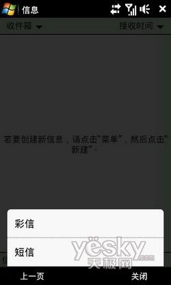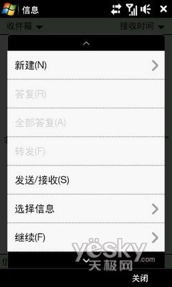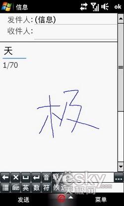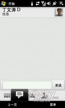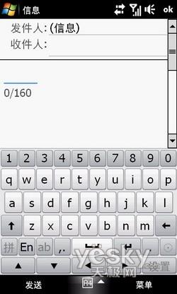 短信界面还是采用短信和彩信整合在一起的方式。但是增加了短信群发的功能,这在之前的WM6.1系统下并没有明确的标示,现在将其添加在菜单中可以随时调用,、应该算是一个很实用的功能。输入法方面还是内置了A4智能输入,全拼输入和手写输入法,方便不同手机操作环境下转到WM系统的用户的需要。