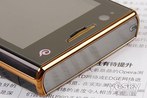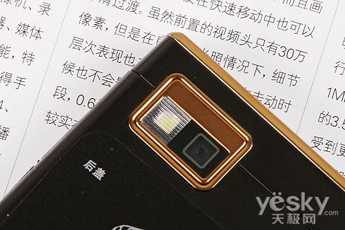 在顶部,采用一块反光镜面材料设计,一个LED信号灯,前置采用了30W像素的摄像头,对应的则有中国电信的3G标志天翼。