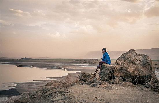 纳特龙湖(Lake Natron)旁,一位名叫Deo的马赛英雄坐在一块岩石上,背景是一片壮丽的景色。摄影:Vlad Cioplea