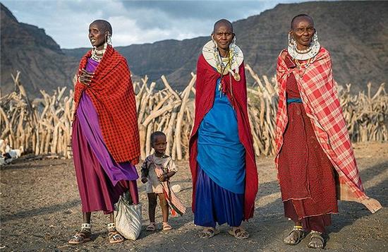 三个穿着彩色服装的女人和一个小孩在纳特龙湖村庄(Natron Lake Village)金色的平原上,那艳丽的服装和首饰让他们显得极为突出。摄影:Vlad Cioplea
